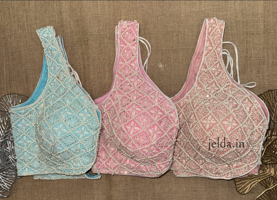 Elegant Chikankari Pearl Work Sweet Heart Neck Blouses – Soft Pastels
