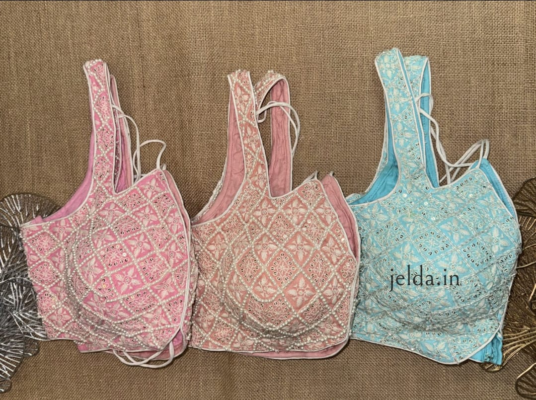 Elevate your ethnic look with these beautifully hand-embroidered Chikankari blouses, designed in soft pastel tones and accented with delicate mirror work. Perfect for festive occasions, mehendi functions, haldi ceremonies, or daytime weddings.
