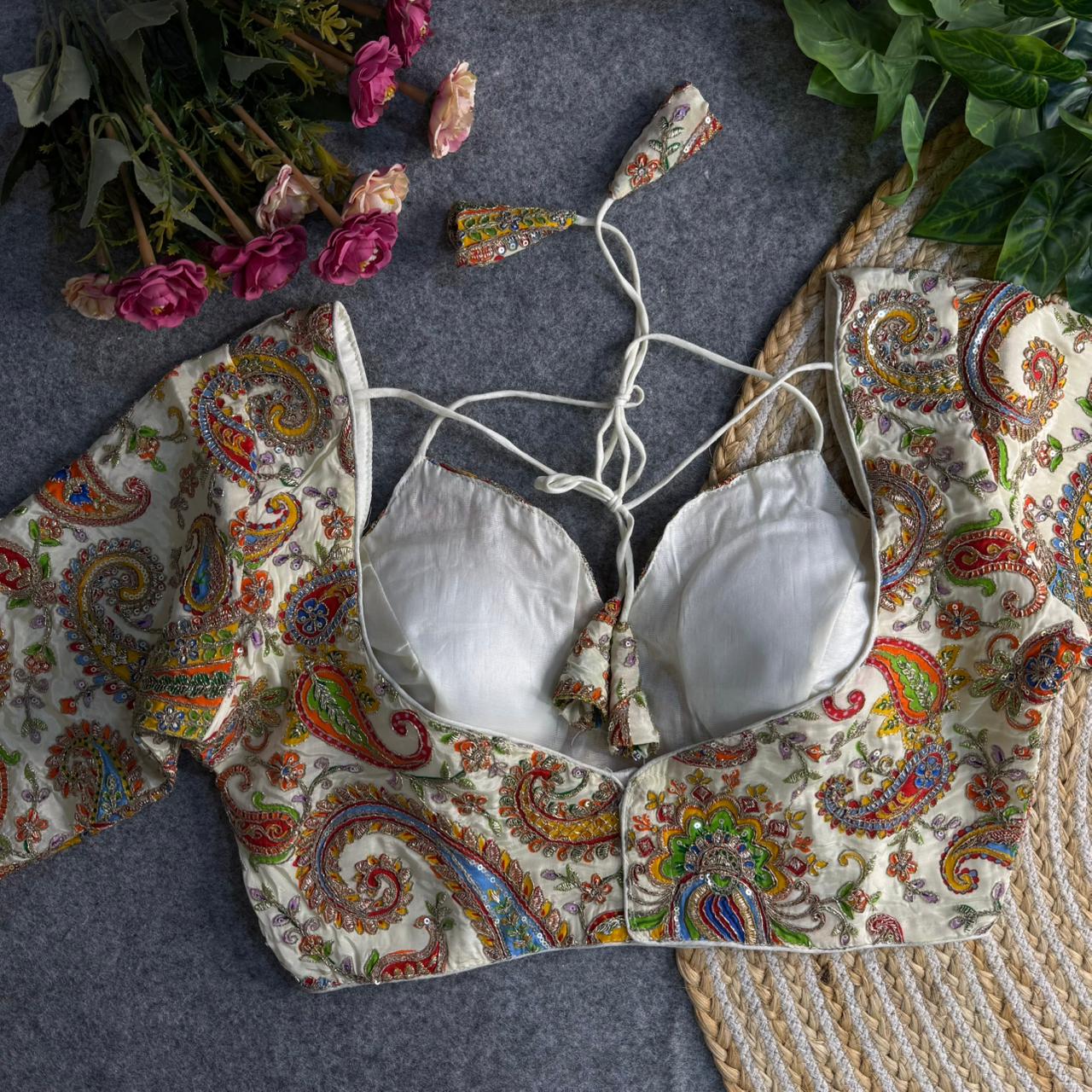 Add a timeless charm to your ethnic wardrobe with this *heavy pure crepe blouse* featuring heavy embroidery with beautiful position print, this blouse blends tradition with contemporary finesse — perfect for weddings, festive occasions, and special celebrations.