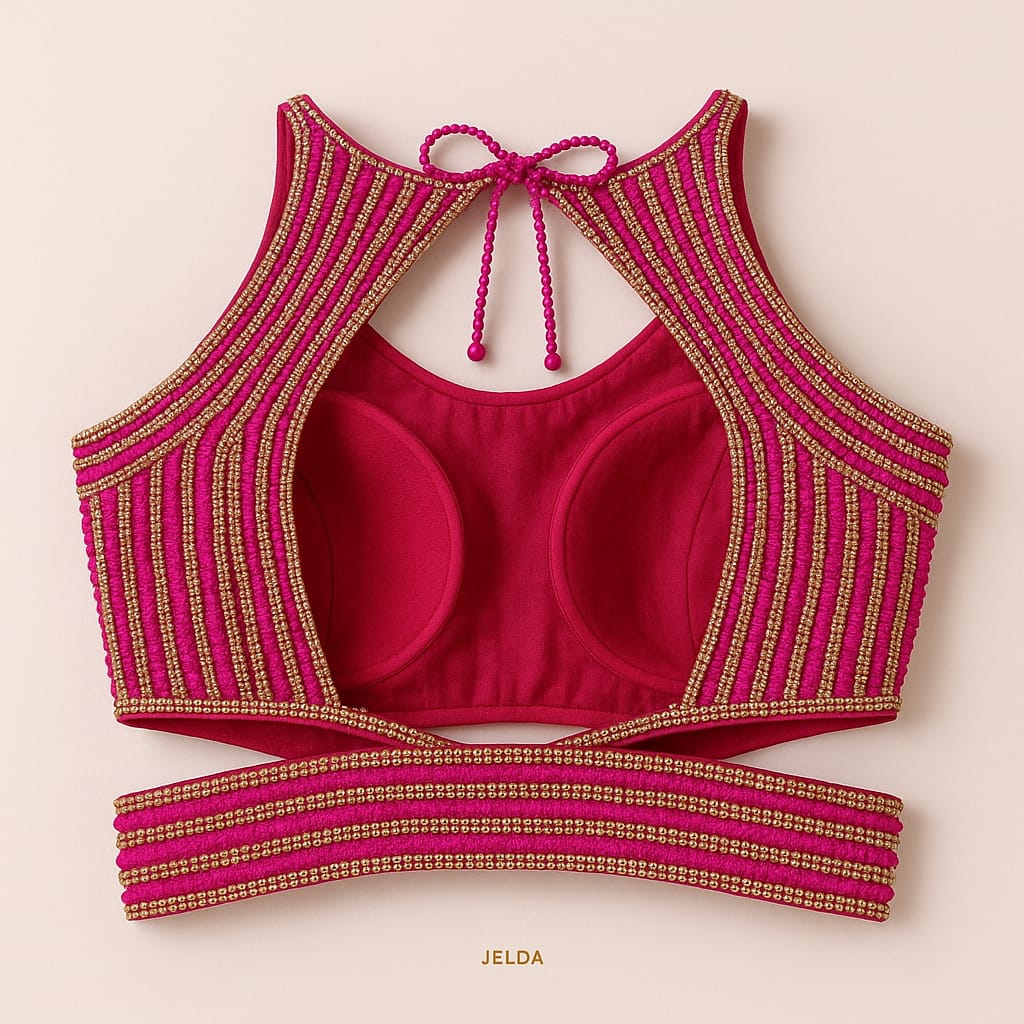 Elevate your ethnic wardrobe with our signature handcrafted blouse, richly adorned with pink and gold beadwork. This high-neck, sleeveless design features a stunning open back and pearl detailing, making it the perfect statement piece for weddings, receptions, and festive occasions.
