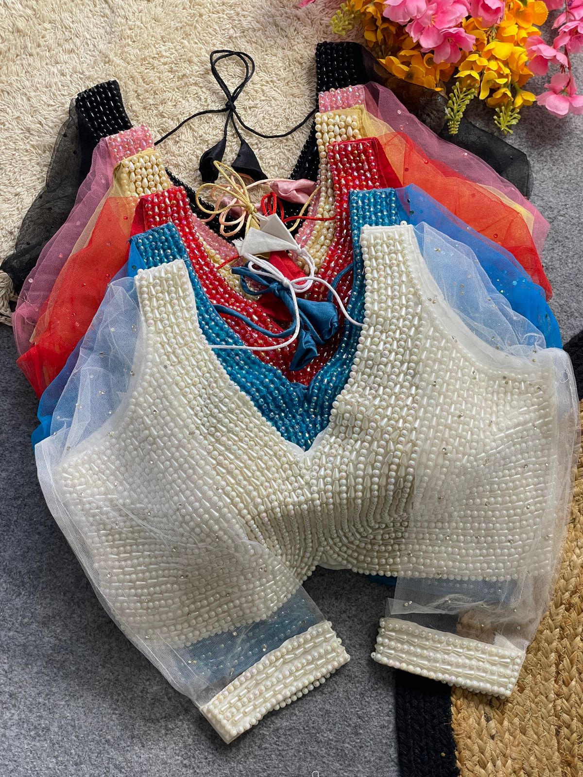 Add a timeless charm to your ethnic wardrobe with this *Pure silk blouse* featuring exquisite beautiful handcrafted pearl work. Crafted for comfort and style, this blouse blends tradition with contemporary finesse — perfect for weddings, festive occasions, and special celebrations.