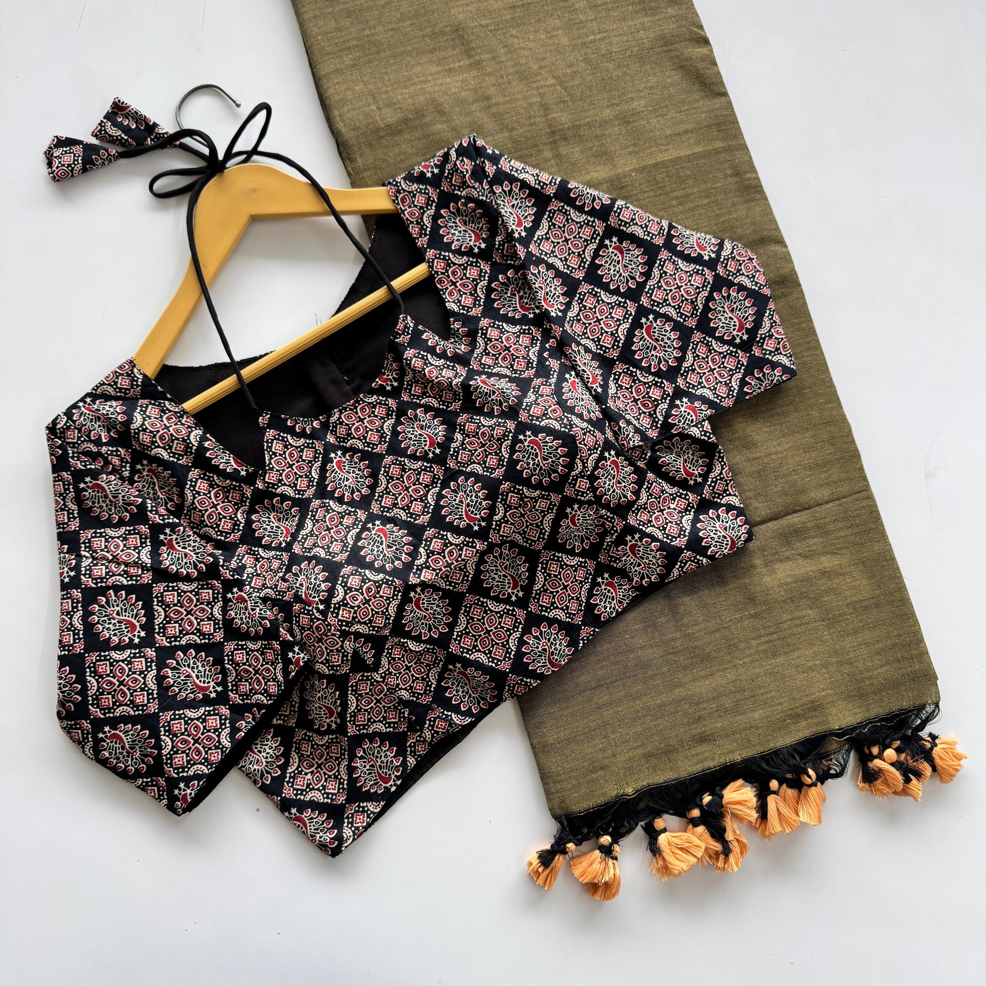 Pure khaadi cotton saree with handmade Latkan and stitch cotton blouse with hand paint